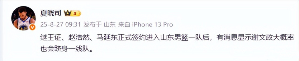 山东男篮近期完成多项人员调整,俱乐部在8月27日正式确认了第四位新晋球员的加盟。根据资深体育记者夏晓司披露的信息,继成功签约王证、赵浩然、马延东三位潜力新秀后,谢文政将成为最后一位晋升一线队的年轻球员。这一系列引援工作显示出主教练邱彪在人才选拔方面的专业眼光。